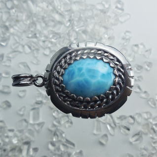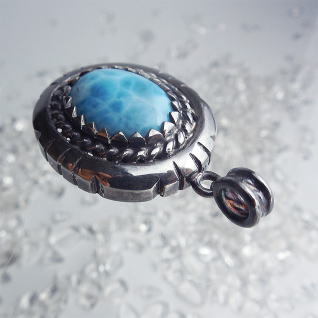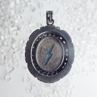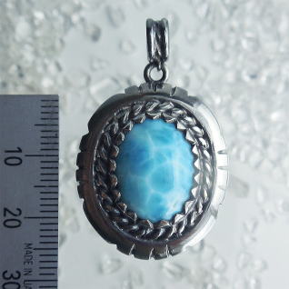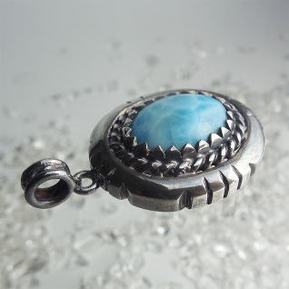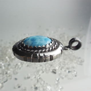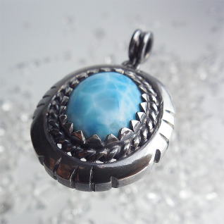 | Native Americanの方々が創るジュエリーには、トルコ石がよく使われます そこを、ラリマーにしてみた Ocean Tribe シリーズ 本体サイズ 28.5 x 24.3 x 8.0 (除くバチカン長) 15.6g 裏面には、海上で見るととっても怖い、稲妻を配しました |