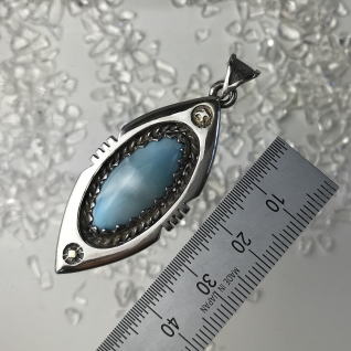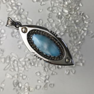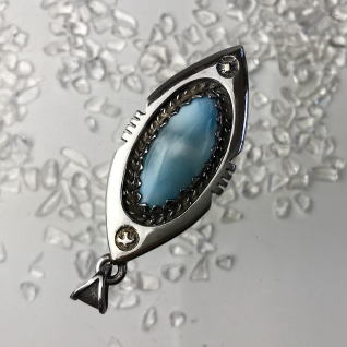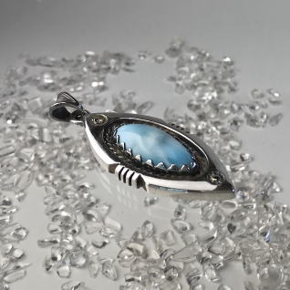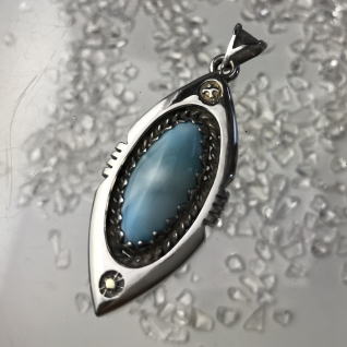| Native Americanの方々が創るジュエリーには、トルコ石がよく使われます そこを、ラリマーにしてみた Ocean Tribe シリーズ このラリマーも、かなり透明度高し 太陽や鳥にはちょっぴり、K18で色気を出しました 本体サイズ 43.5 x 20.5 x 7.2 mm 16.0g |