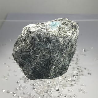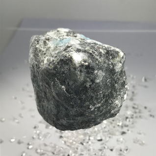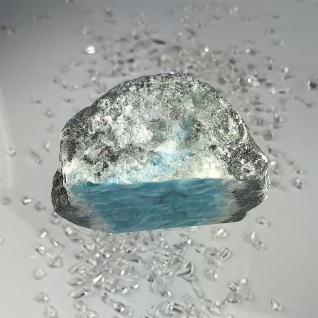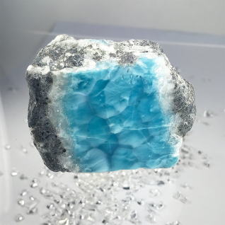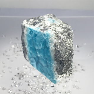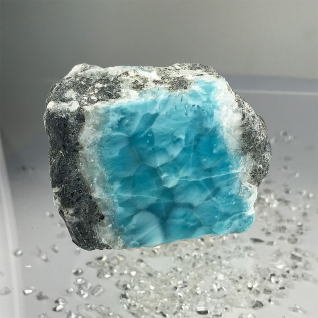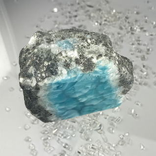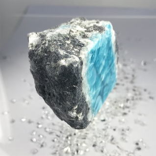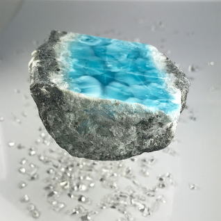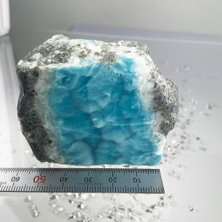 | ラリマーの原石は、もしかしたら珪化木?なのかもしれないと ラリマーの原石には、棒状、筒状?のものが見られます これは、もしかしたら地中に埋まった木が置換したものかもしれません そんな、筒状のラリマーを半分にしたもの |